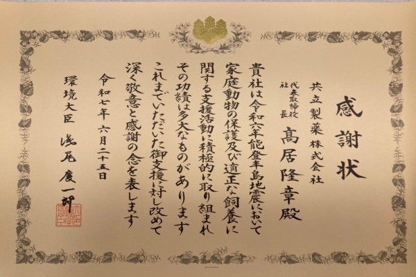 Kyoritsu Seiyaku is honored to announce the awarding of a Certificate of Appreciation from the Ministry of the Environment of Japan on June 25, 2025, in recognition of its support for the protection of companion animals affected by the 2024 Noto Peninsula Earthquake.